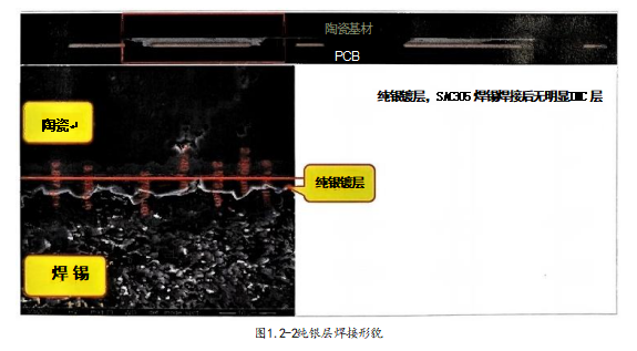 溶接在無鉛接工藝中應用廣泛, PCBA業(yè)者并不陌生,但業(yè)者較少特別留意區(qū)分。如陶瓷本體涂鍍厚銀層, 使用SAC305焊錫焊接,焊接界面并無明顯的界面合金層,圖1.2-2純銀層焊接形貌。純銀導線使用6337共晶 焊料焊接,形成的焊點也不是Ag3Sn 界面,焊接界面就是錫銀混合物。在IC Package領域,溶接也十分常見, 如純金焊點使用金- 錫焊料焊接,其本質也是溶接。