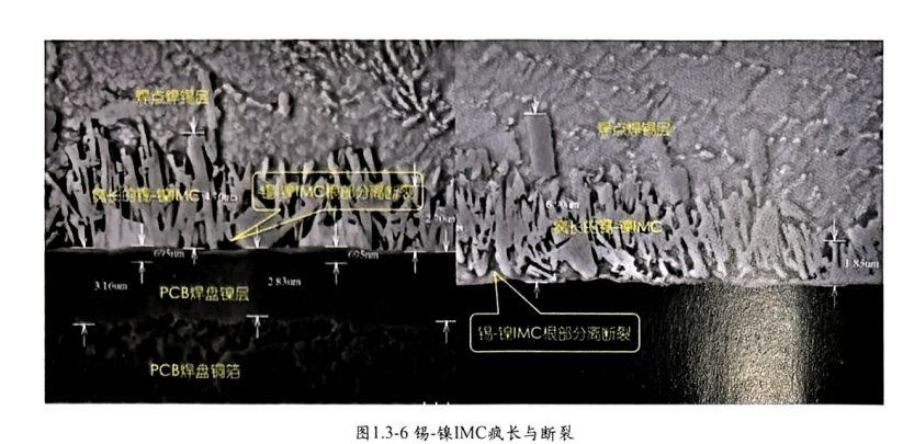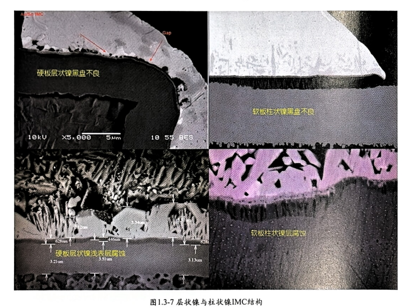 鎳層為柱狀結構,俗稱柱狀鎳。體現(xiàn)在焊點切片形貌上有所不同,特別是鍍層處理不良、有氧化腐蝕時特別明顯,圖1.3-7層狀鎳與柱狀鎳 IMC結構。